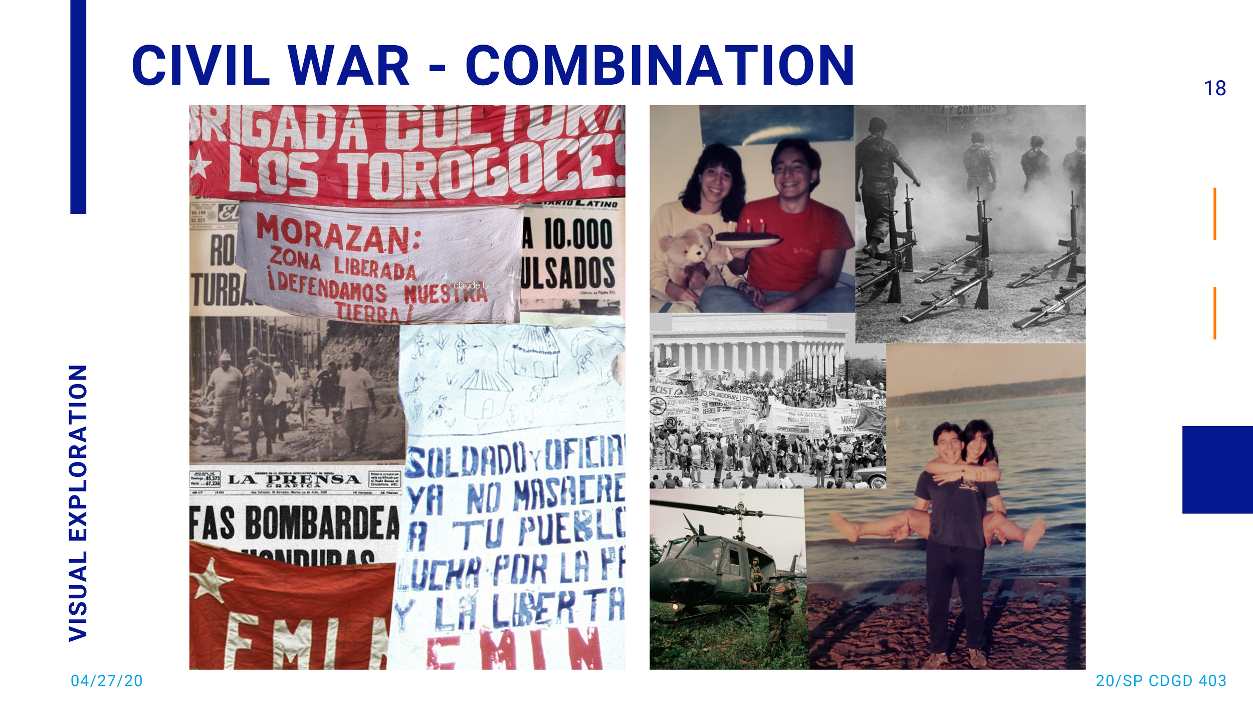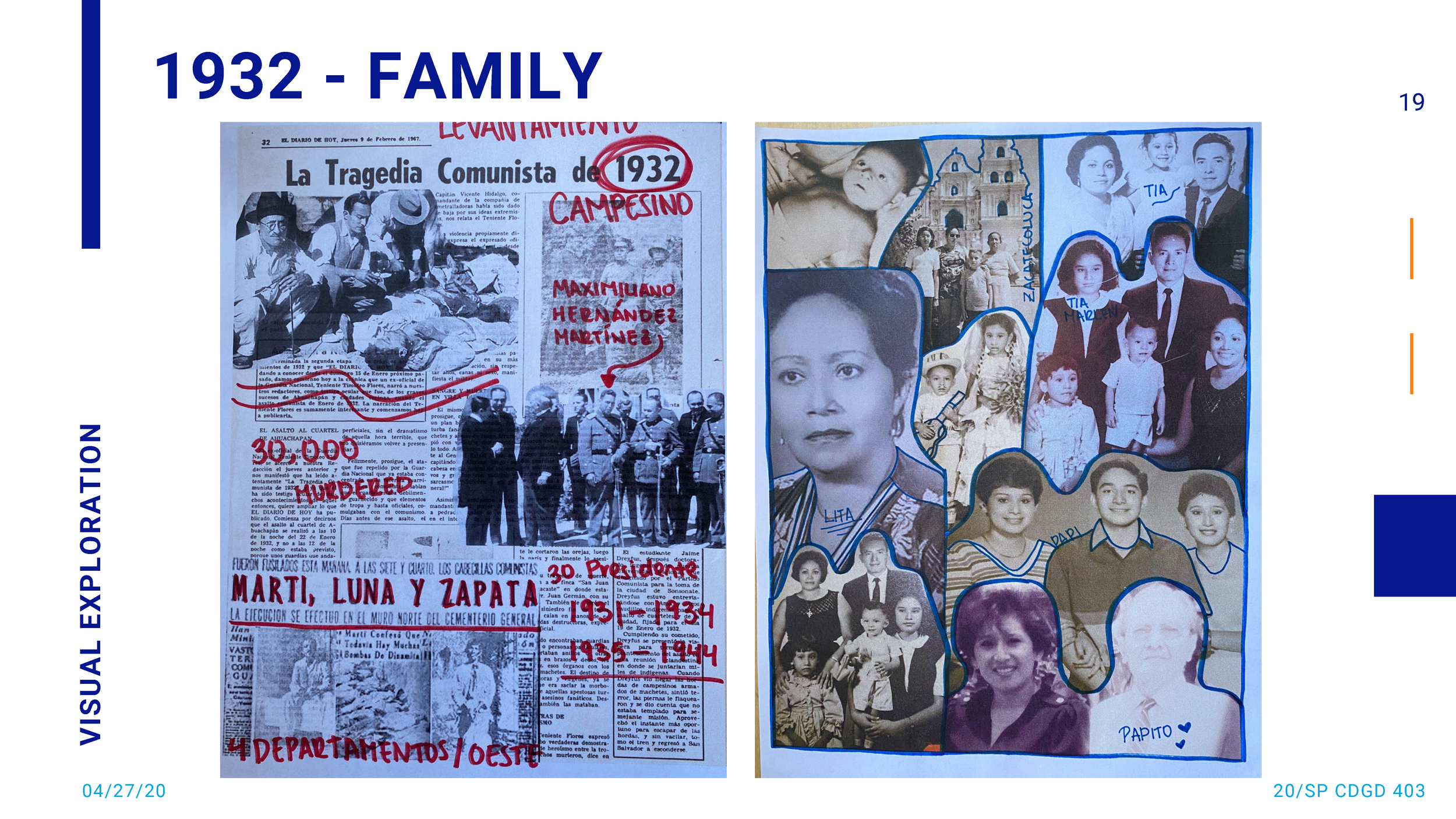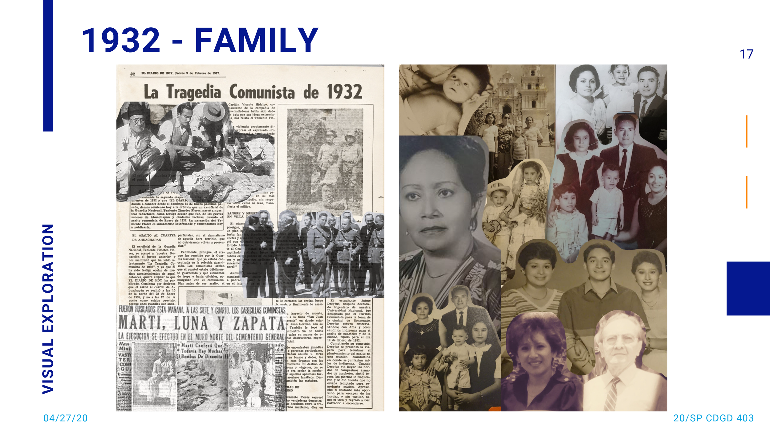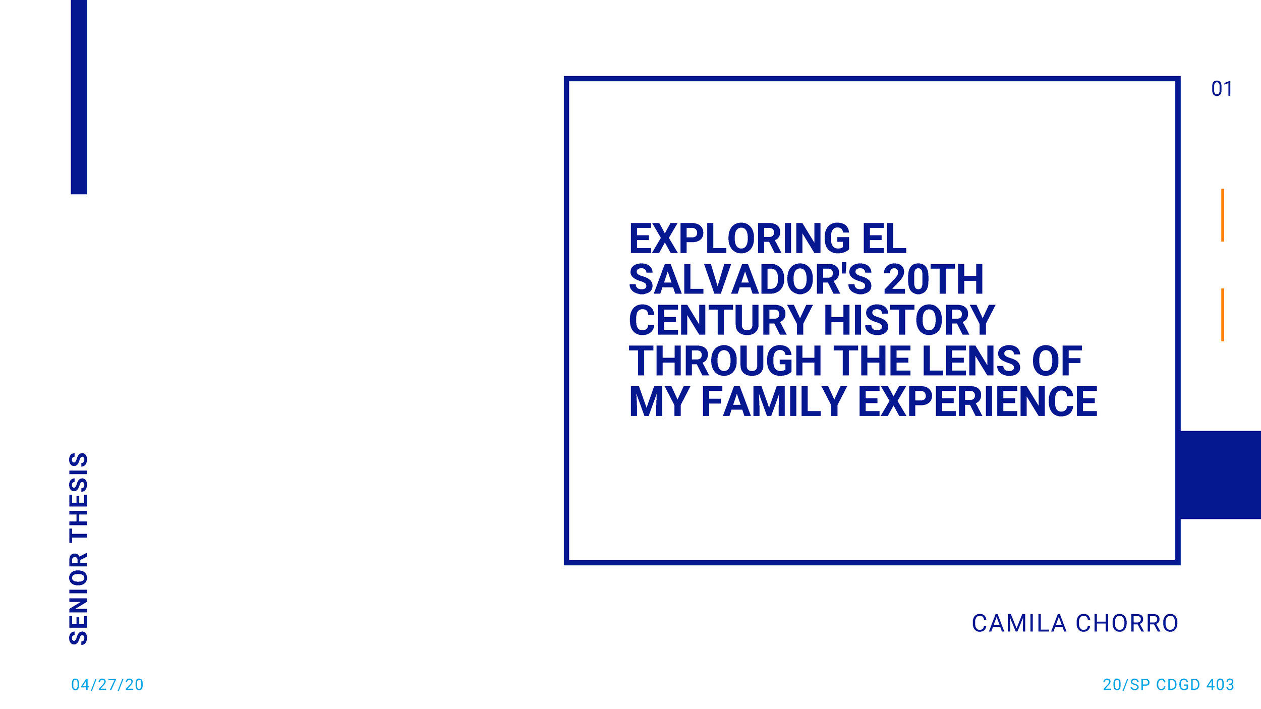 In my thesis, I aimed to raise awareness about the complex history of El Salvador by examining my family's experiences throughout the 20th century. I conducted extensive research by utilizing library resources, watching documentaries, and attending lectures. My focus was on the social and economic conditions and the events that led to the Civil War. Additionally, I conducted interviews with various family members to gather their personal accounts of these events, specifically highlighting their impact on our family. I also developed a website featuring a detailed timeline showcasing the important dates that have contributed to shaping El Salvador's current state, and demonstrating how the Chorro family narrative aligns with the broader historical context.